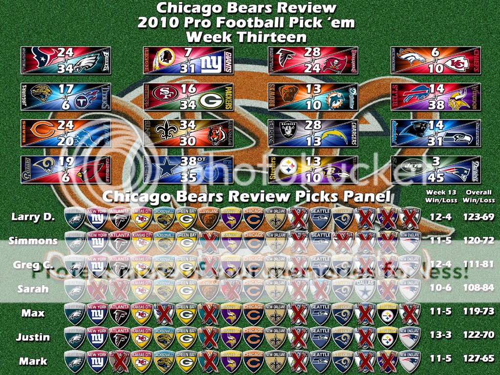 Here is the Week Thirteen Results page and the Picks Panel Standings graphic as well.