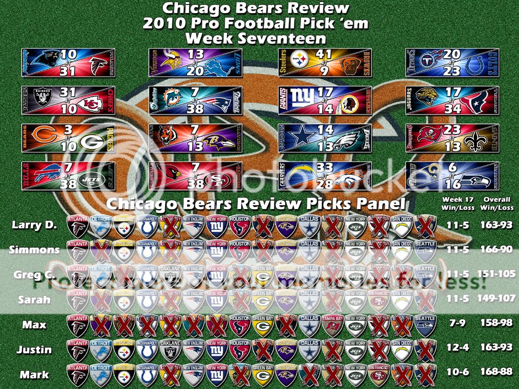 Congratulations to Mark Bailey our 2010 Regular Season Pick 'Em Champ with a record of 168-88 for the year. He was able to hold off Simmons' late charge and win dethrone our reigning champion by a 2-game margin.