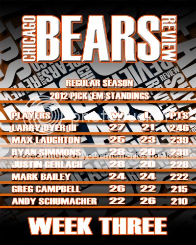 Overall it was another brutal week for us pick-wise. Simmons managed a Week Three best 9-7 record, but the 69 points generated by only 8 wins by me was tops for the week. It was also good enough to vault me to the top of the leader board with 246 points.