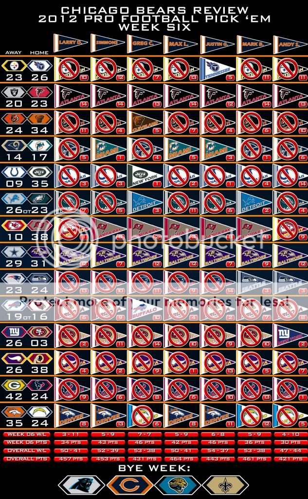 Here is the Week Six Results page and the Picks Panel Standings graphic.
