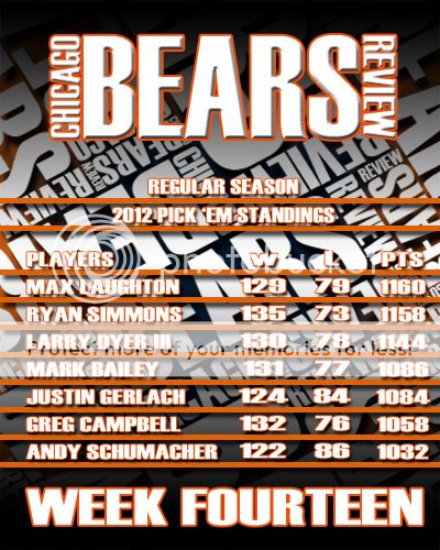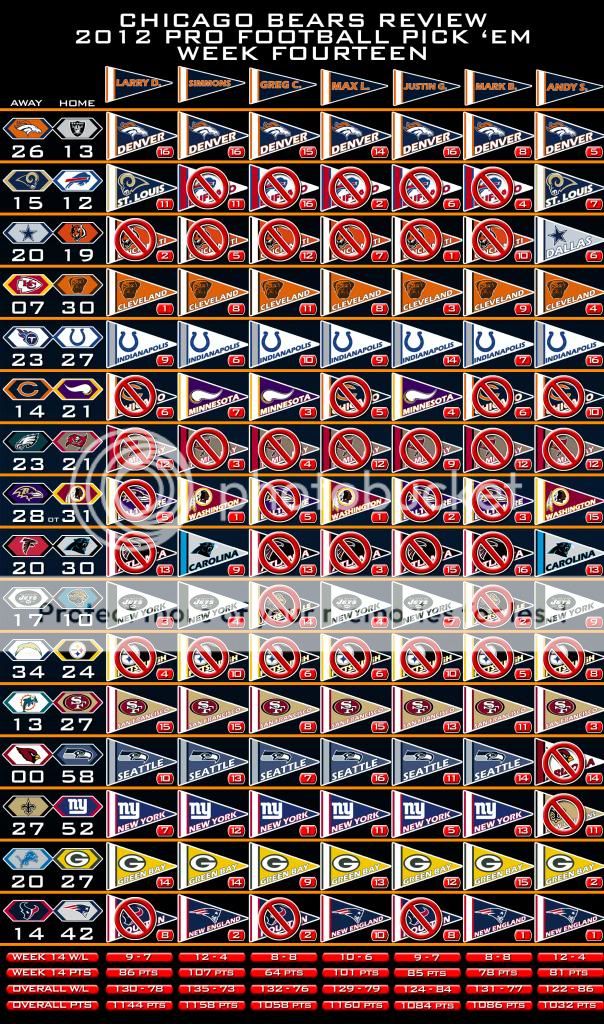 Here is the Week Fourteen Results page and the Picks Panel Standings graphic.