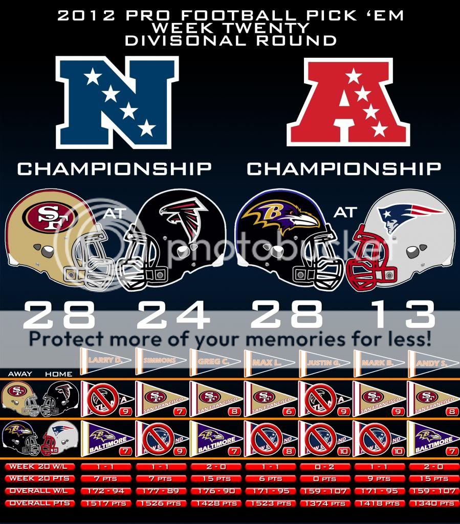 Here are the Conference Championship Round results and the Picks Panel Standings graphic.